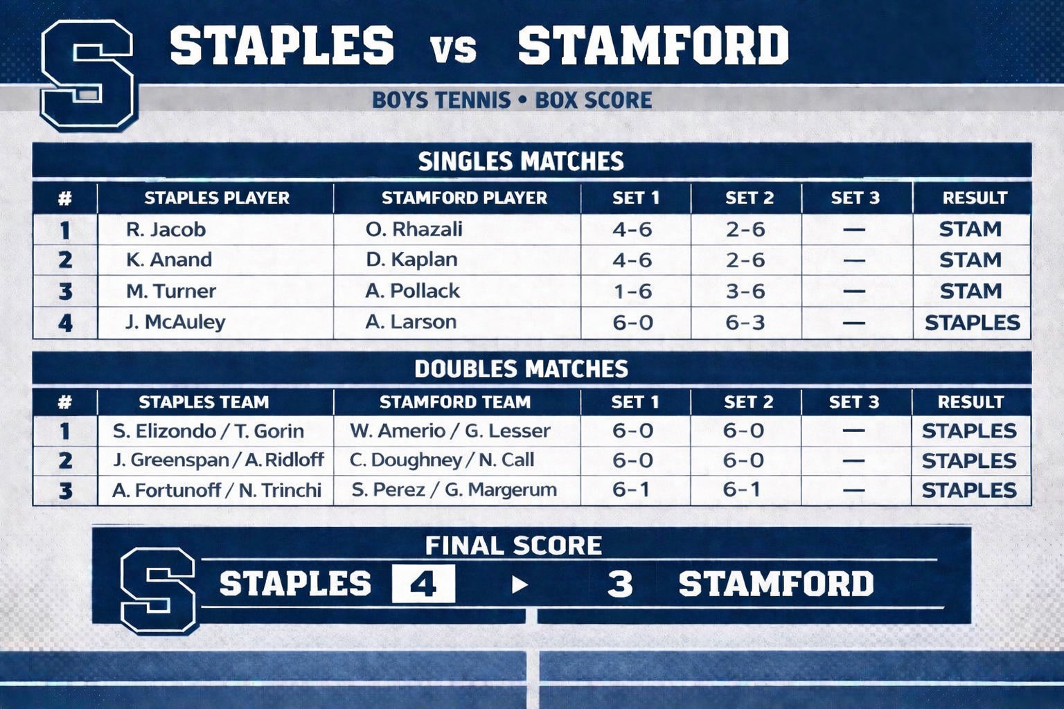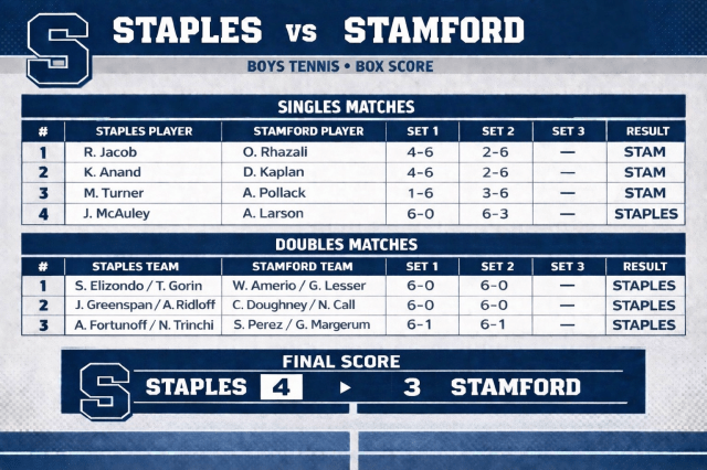 Staples Wins Against Stamford 4-3