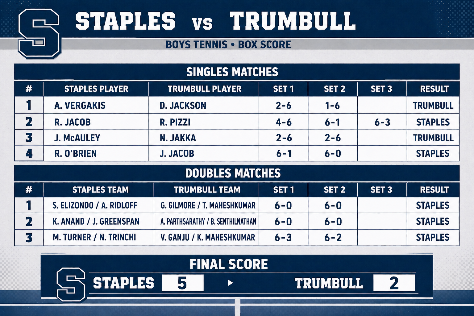 - JV Results by Match